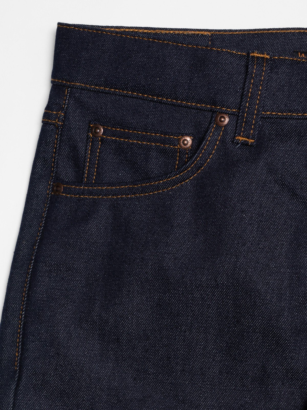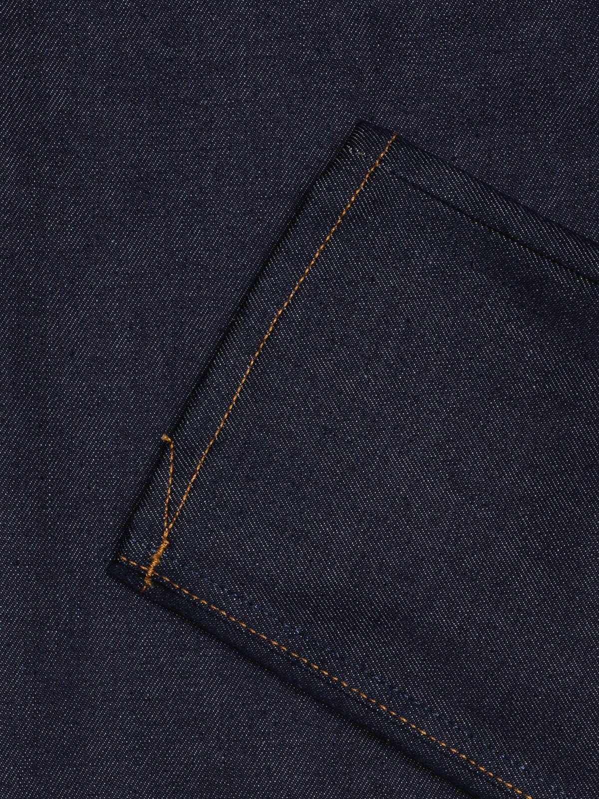 Jeans brut à jambe étroite, confectionné en denim légèrement stretch sec et saturé. Les fils flammés filés à l’anneau créent une subtile teinte verte, qui s’intensifiera et développera des marques d’usure distinctives avec le temps. Fabriqué en coton biologique.