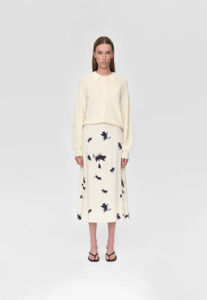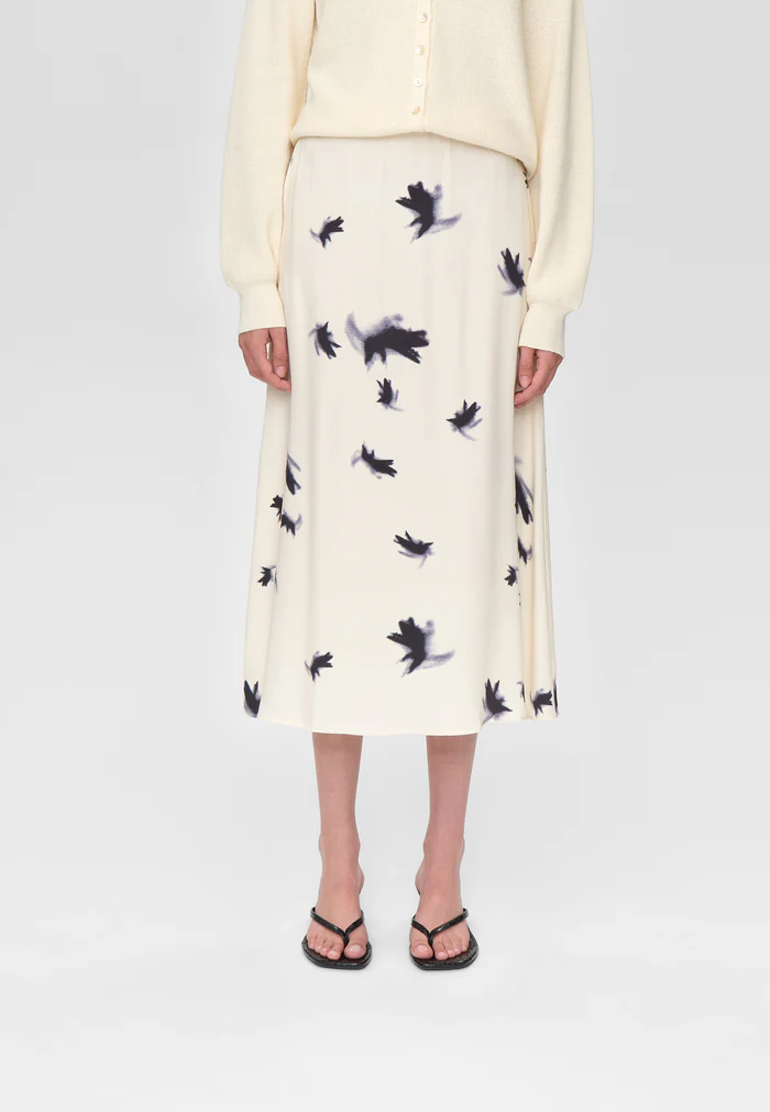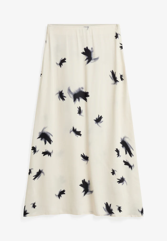 Jupe mi-longue élégante en viscose imprimée, dotée d’une taille élastiquée à l’intérieur. Coupe en biais pour une silhouette plus fluide.