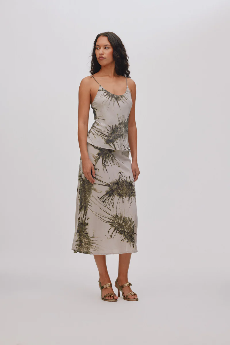 Sublimez votre tenue d’une élégance naturelle avec cette jupe longue en biais teintée à la main.