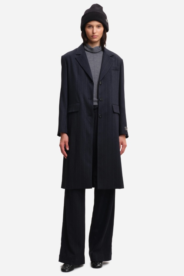 Le manteau TOM incarne l’élégance urbaine avec sa coupe droite et ses rayures navy discrètes qui allongent la silhouette. Conçu dans un esprit tailoring, il s’impose comme une pièce forte et intemporelle du vestiaire. Ses détails raffinés, comme les boutons gravés et l’étiquette signature LONNBERG, lui confèrent une allure moderne et sophistiquée.
