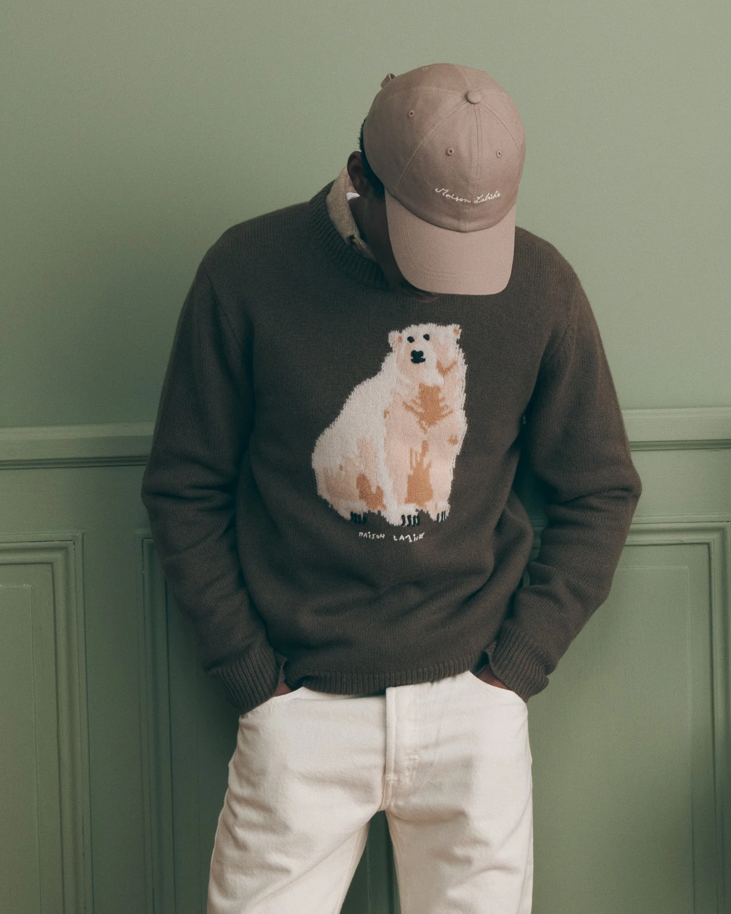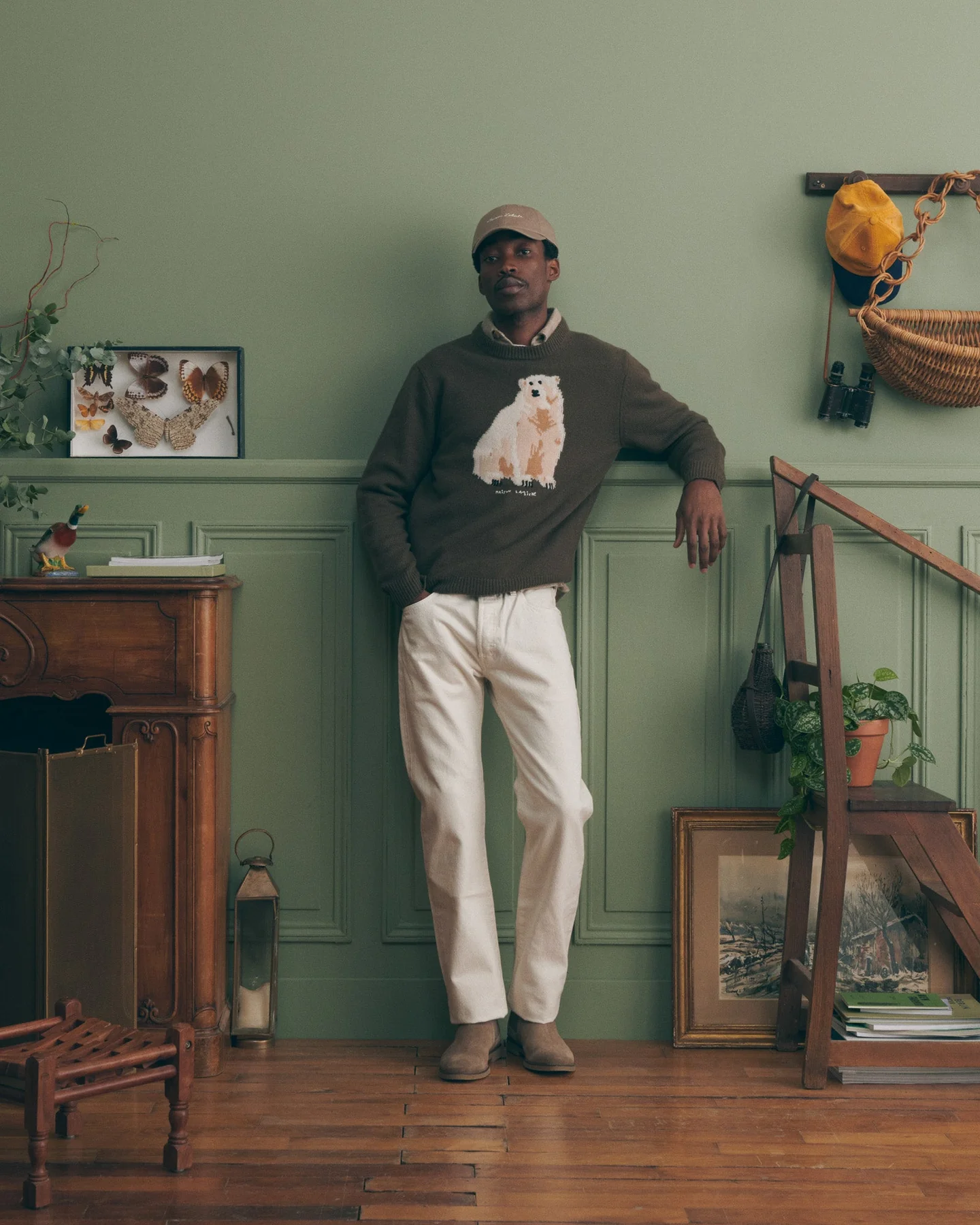 Le pull Mawas a une coupe ample avec des finitions en bas du corps, des poignets et à l’encolure en bord-côte. Sa broderie illustre une des marottes de Labiche : les bêtes, les animaux, les bestioles