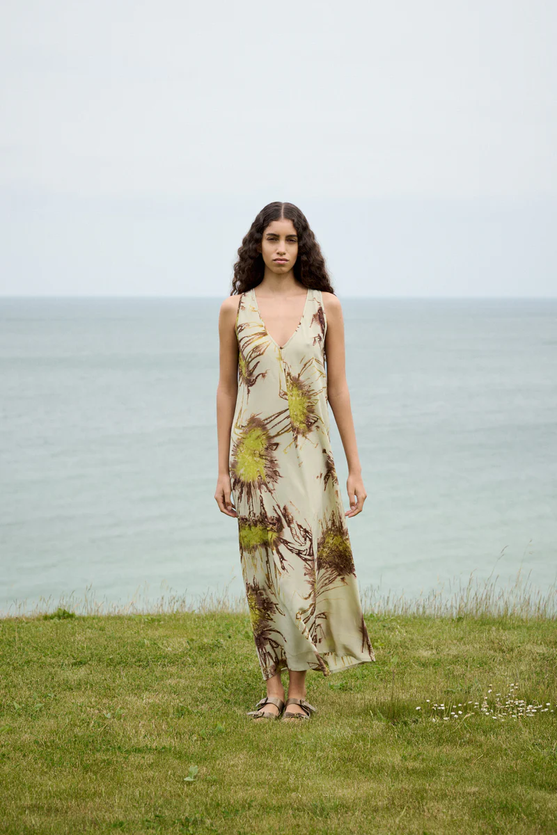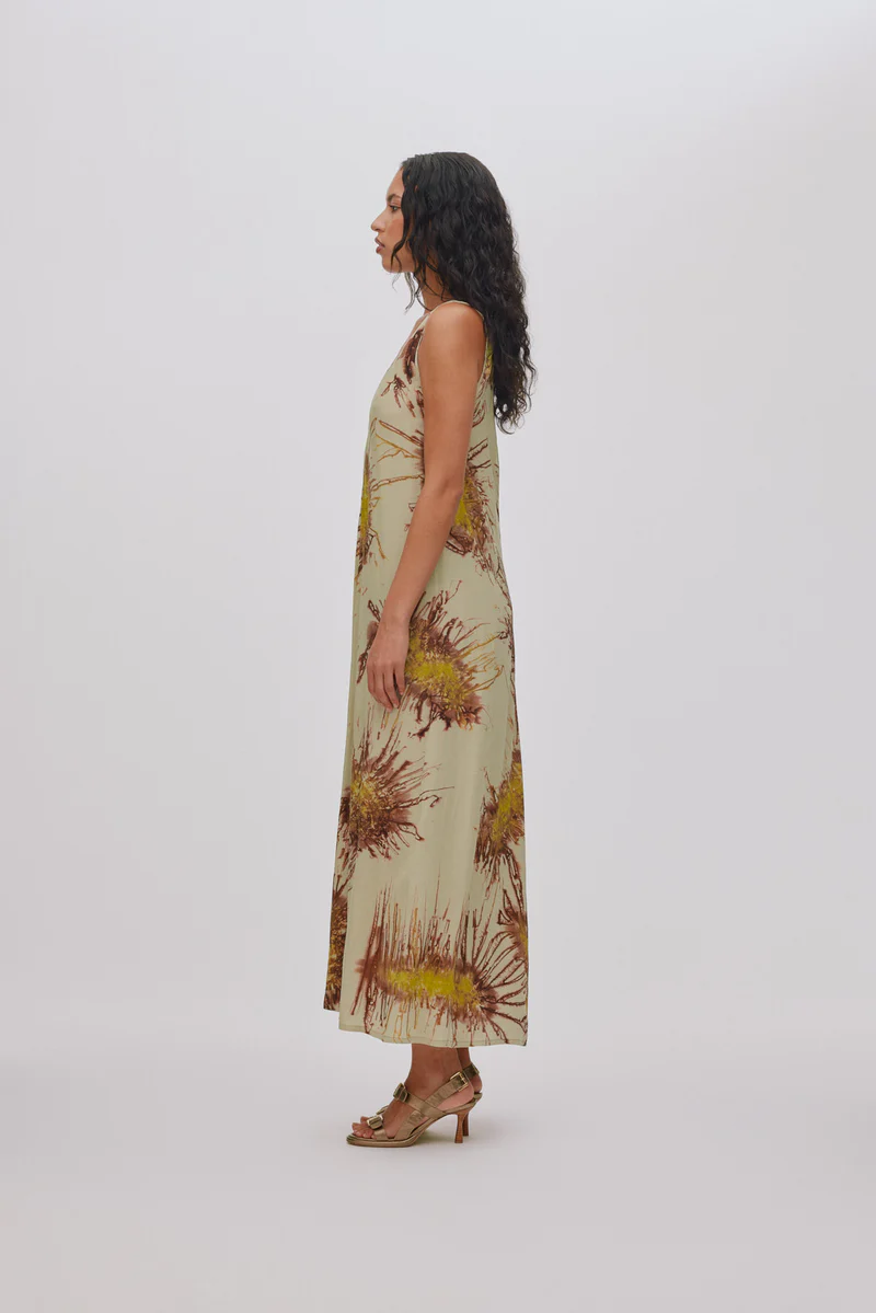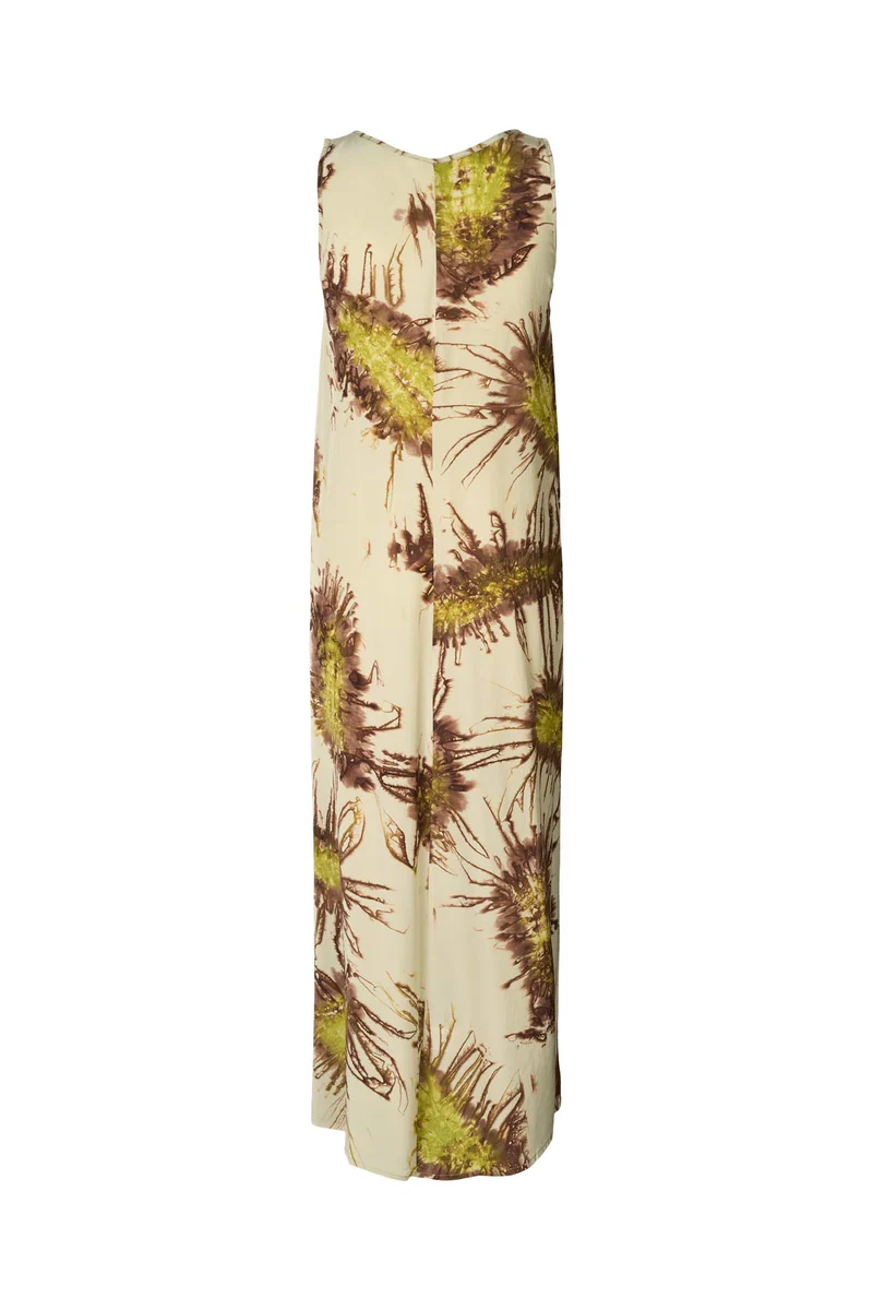 Cette robe longue se distingue par son motif unique teint à la main.