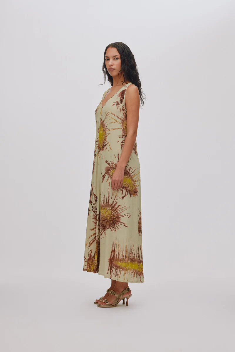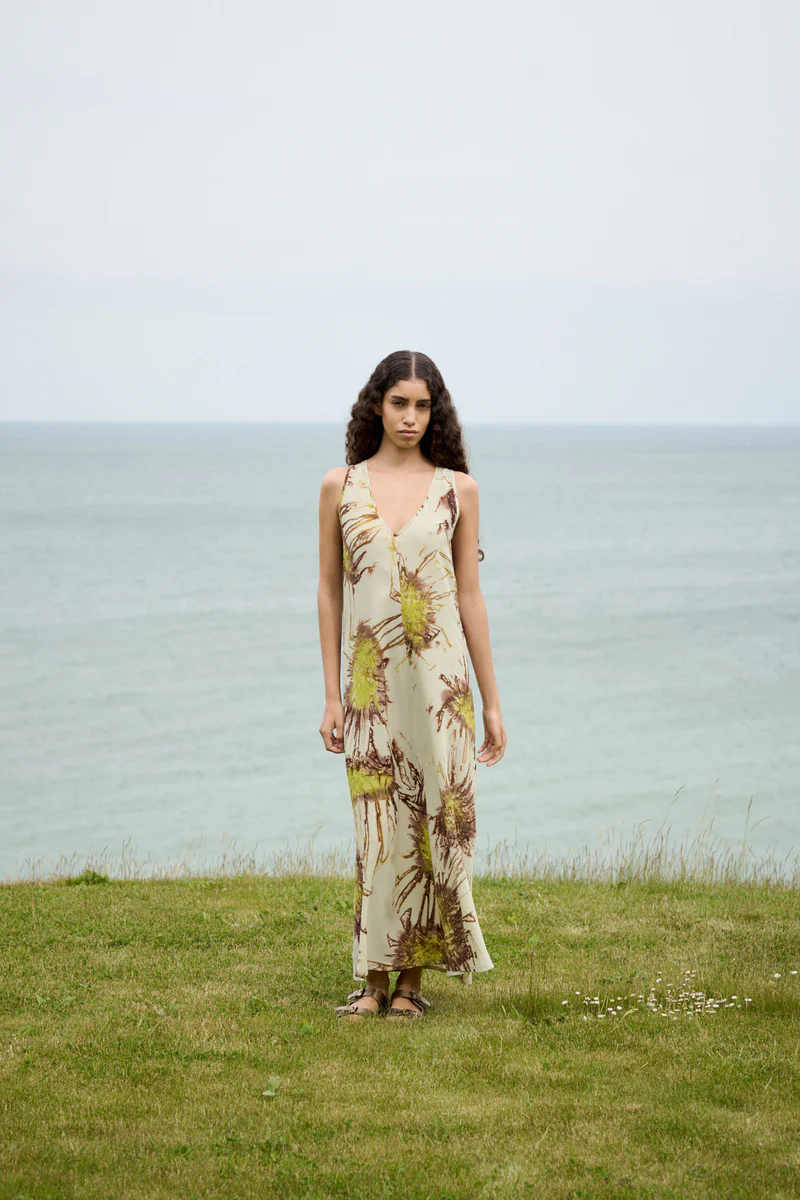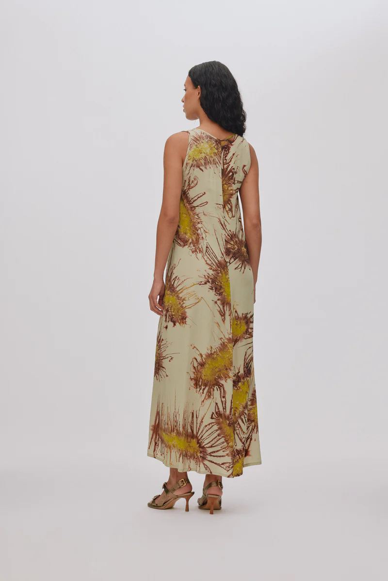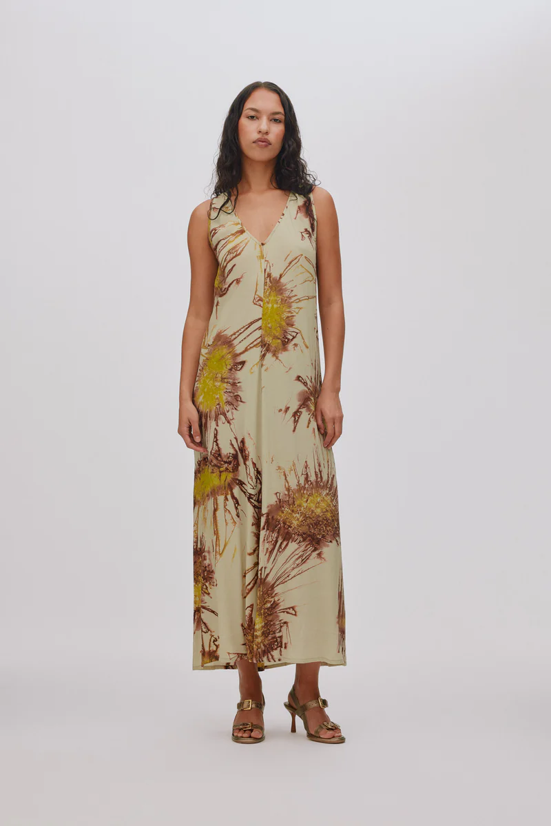 Cette robe longue se distingue par son motif unique teint à la main.