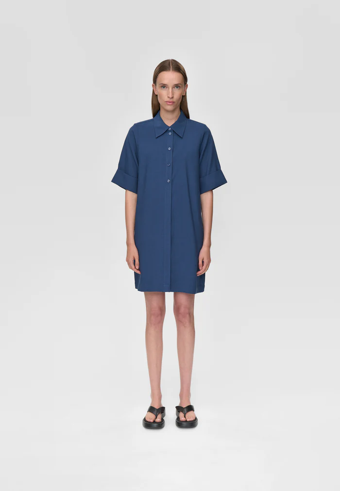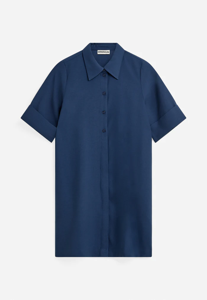 Robe-chemise courte en viscose et lin. Manches mi-longues à revers haut et patte de boutonnage partiellement dissimulée sur le devant.