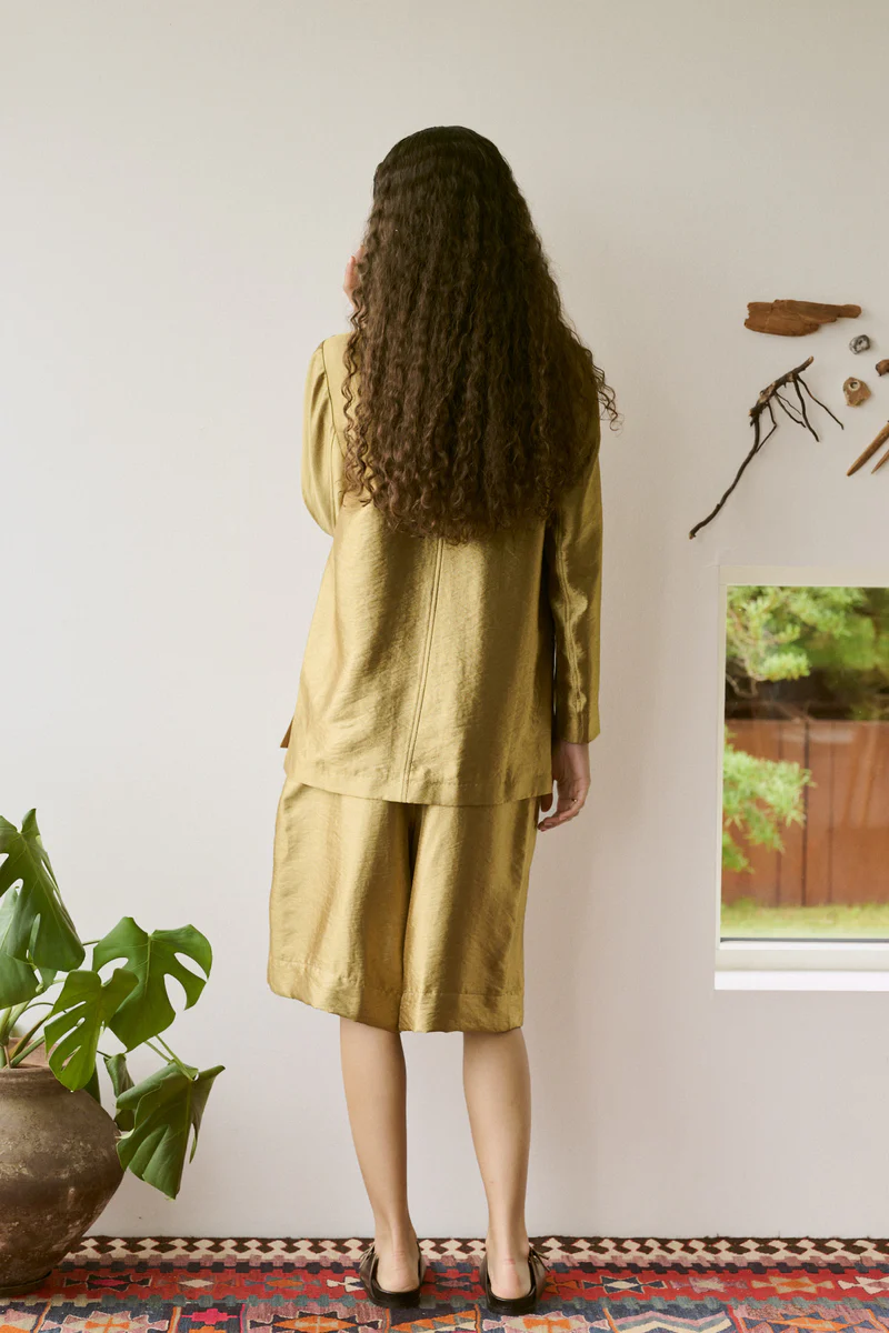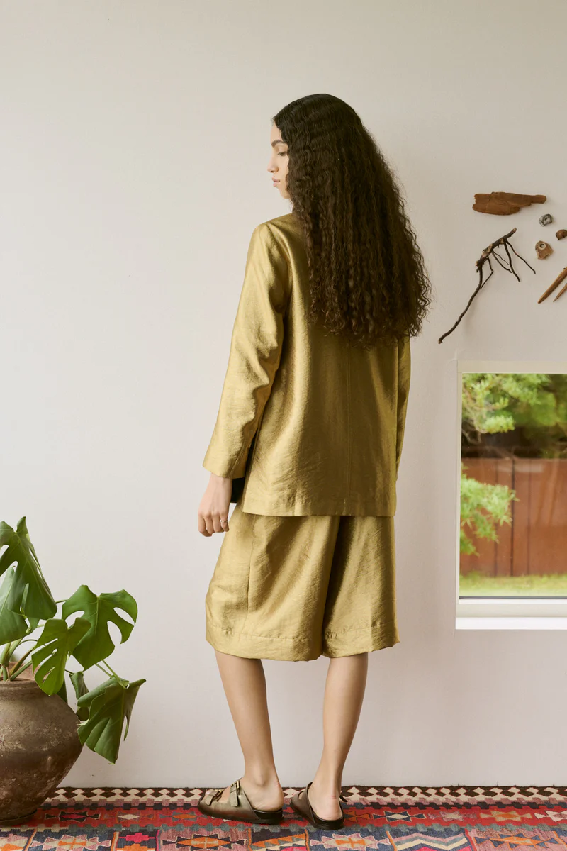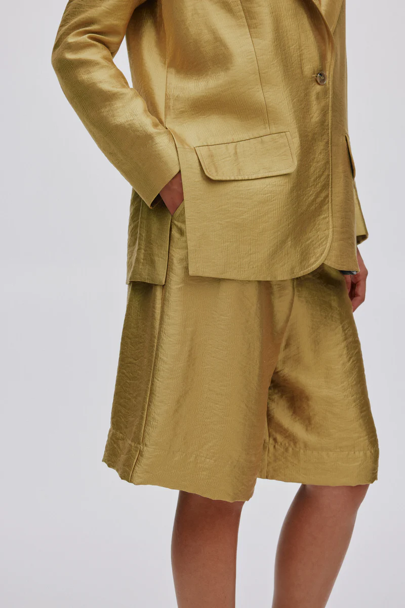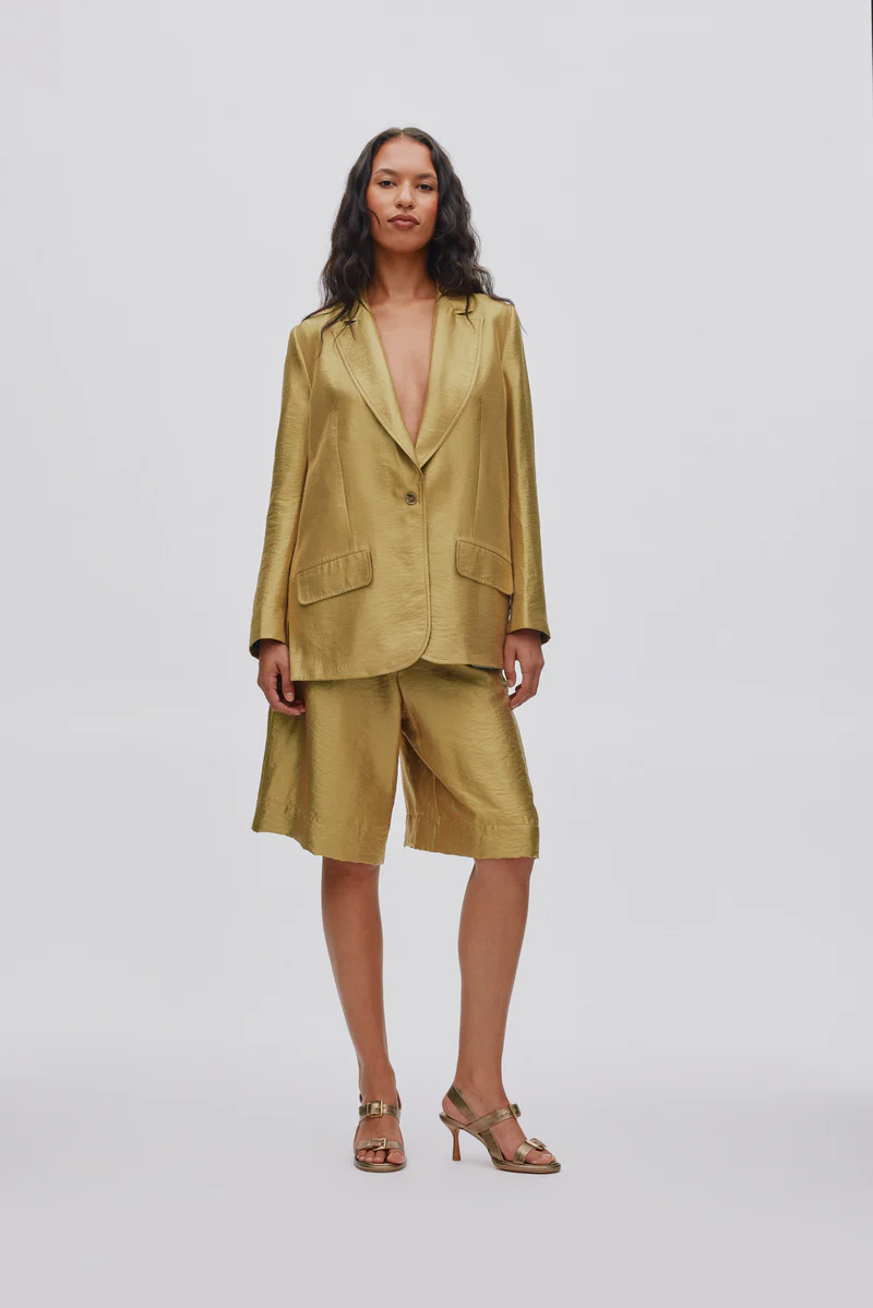 Confectionné dans un élégant coloris doré, il apporte une touche de caractère à votre tenue, que vous le portiez avec un t-shirt et des mules ou avec la veste assortie pour un total look doré.