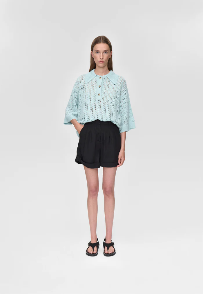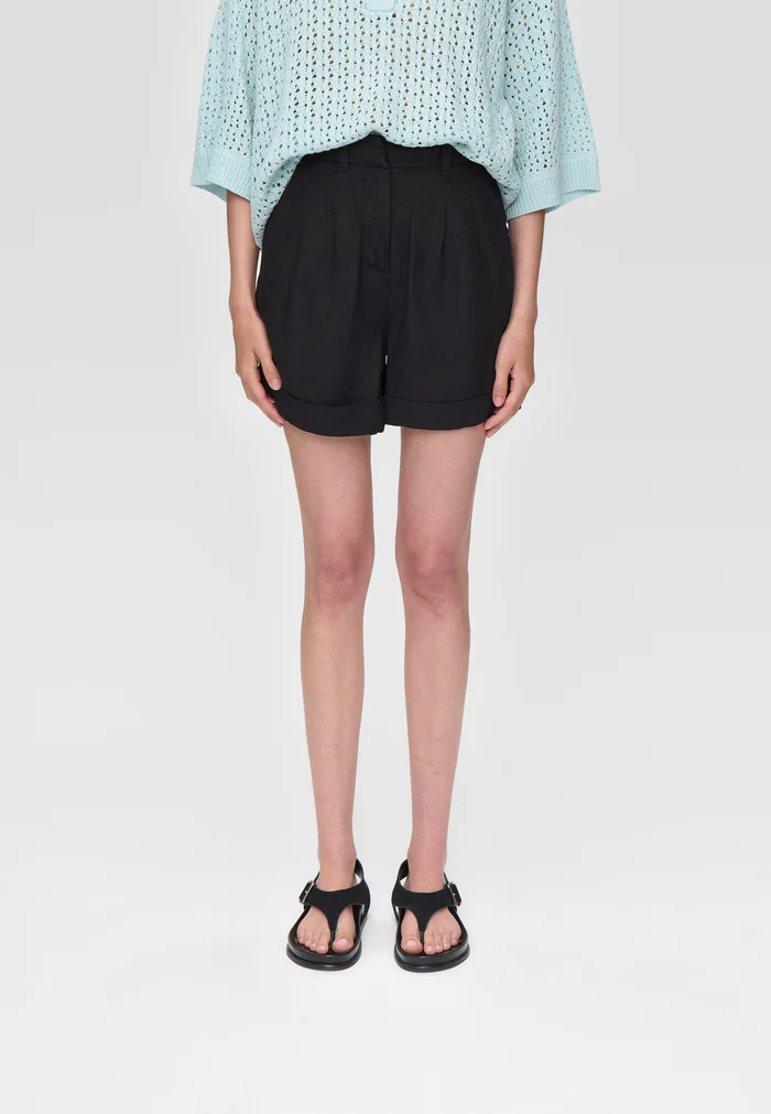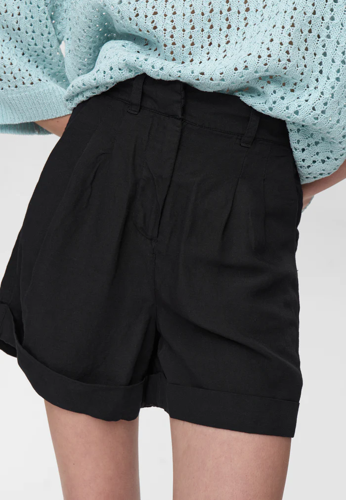 Short taille mi-haute confectionné dans un luxueux mélange de lin et de viscose. Il présente un devant plissé, des poches latérales obliques et une poche passepoilée à l’arrière pour une allure plus élégante.