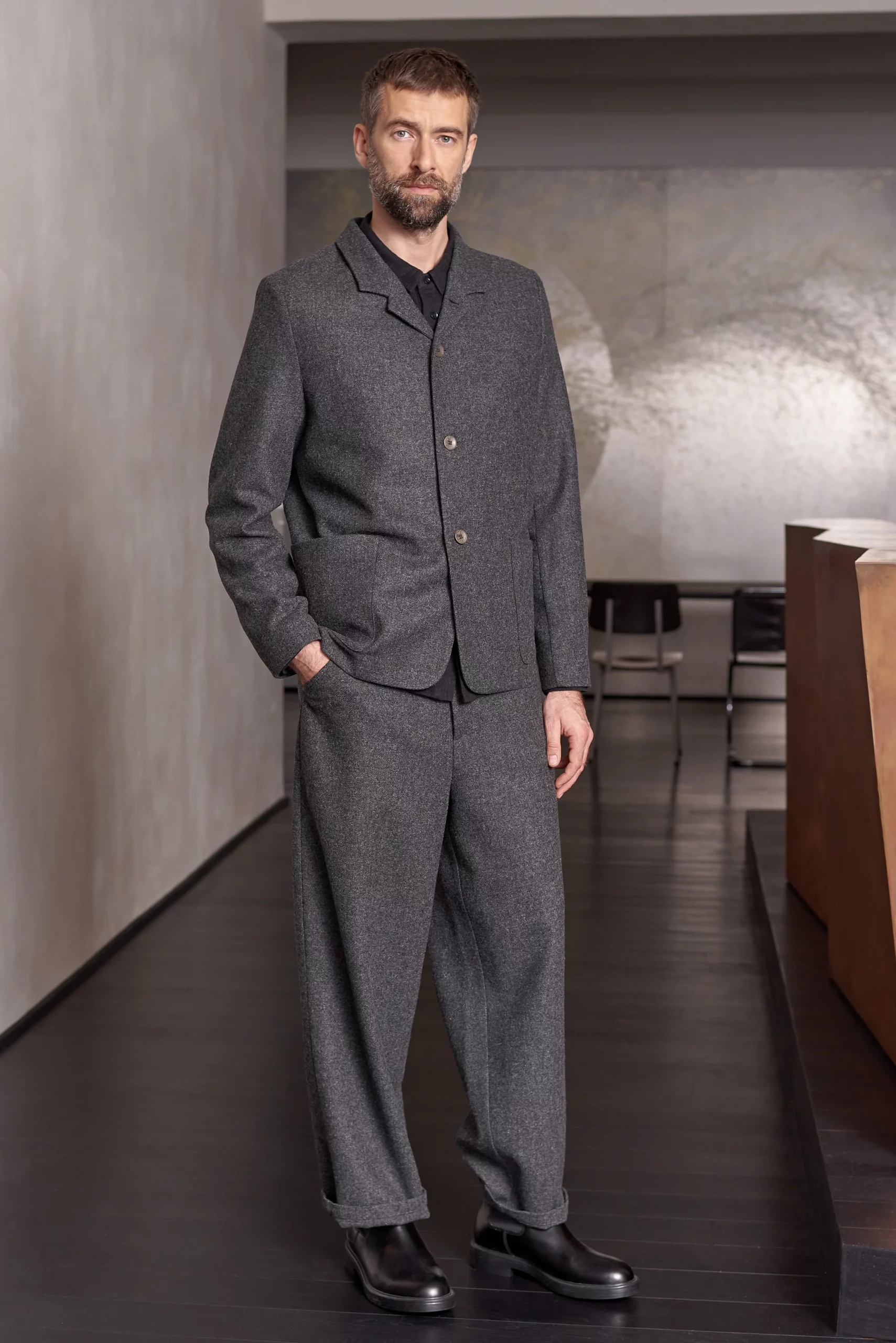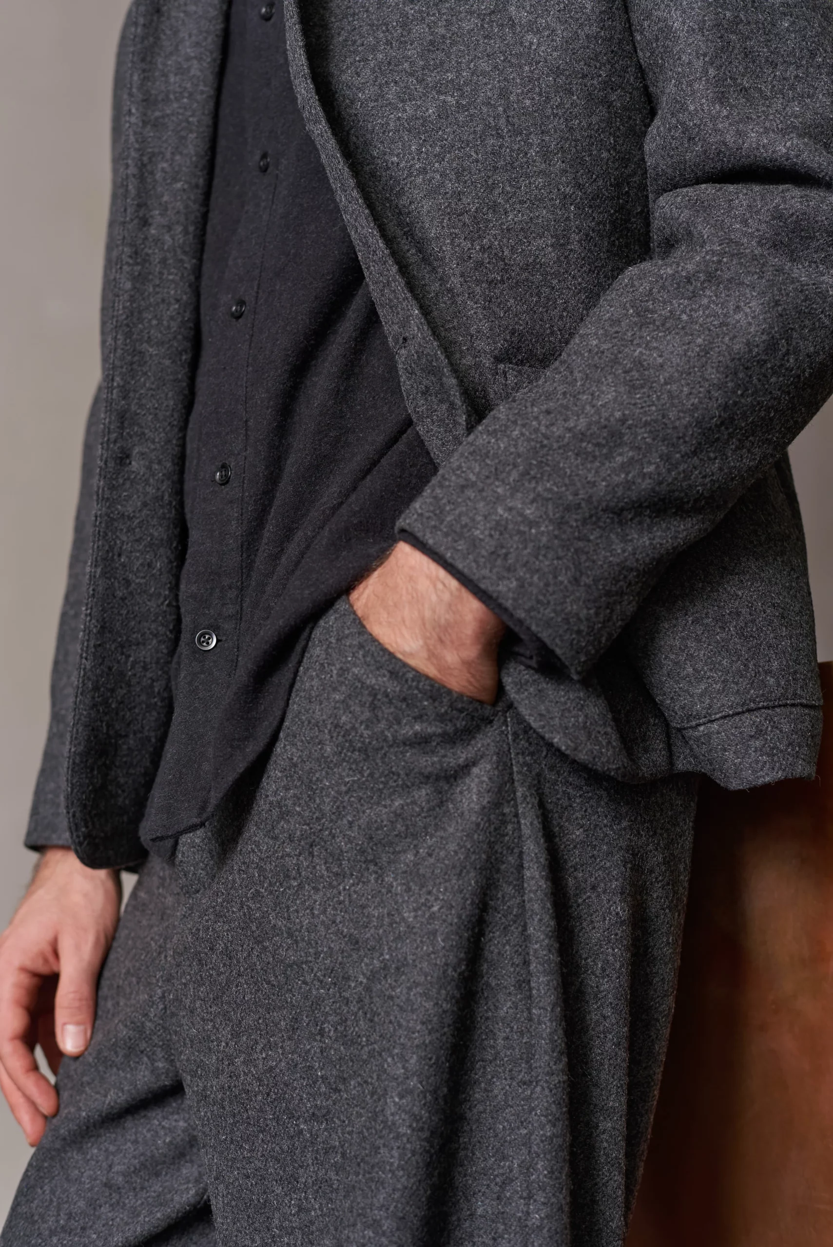 Ce tissu de costume est confectionné en laine d’agneau européenne cardée et mulesing free, au toucher doux et à la surface richement mélangée.