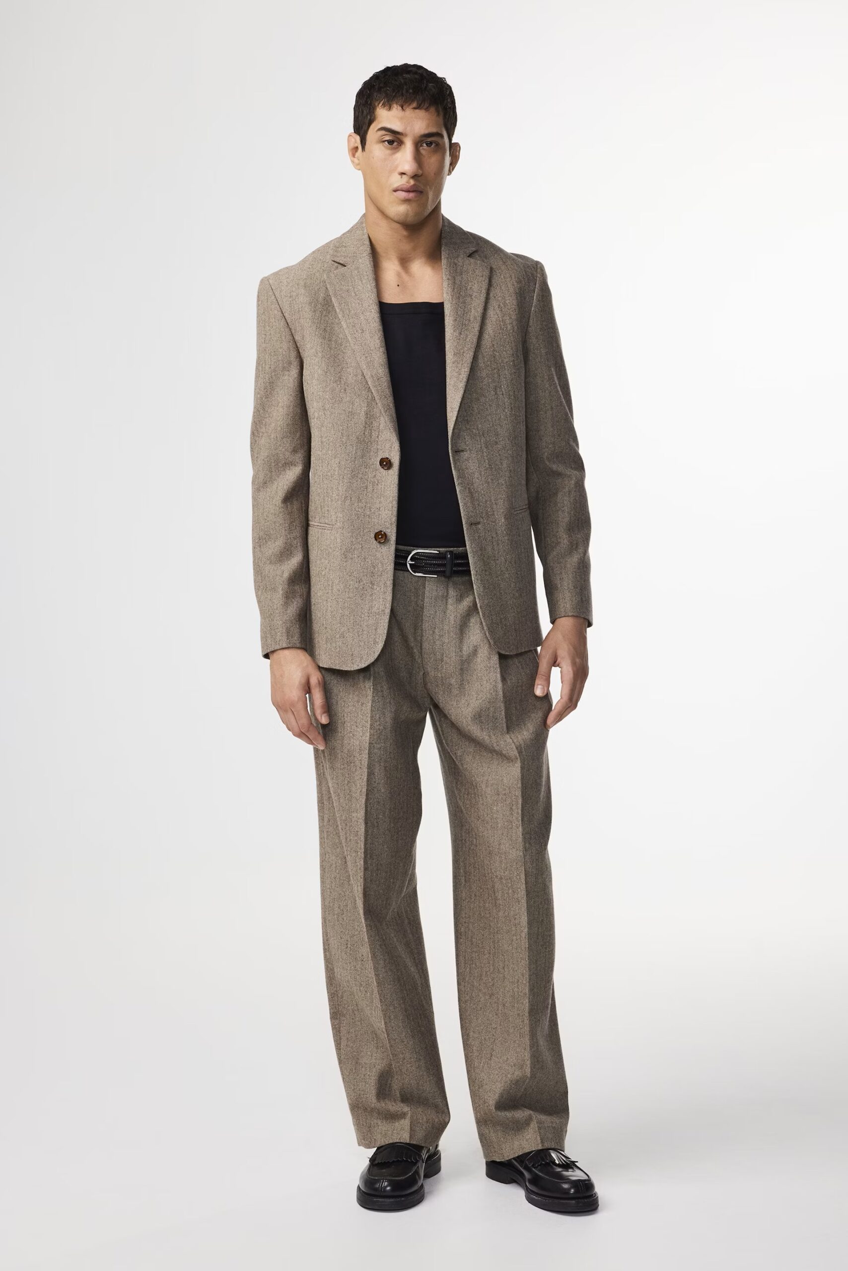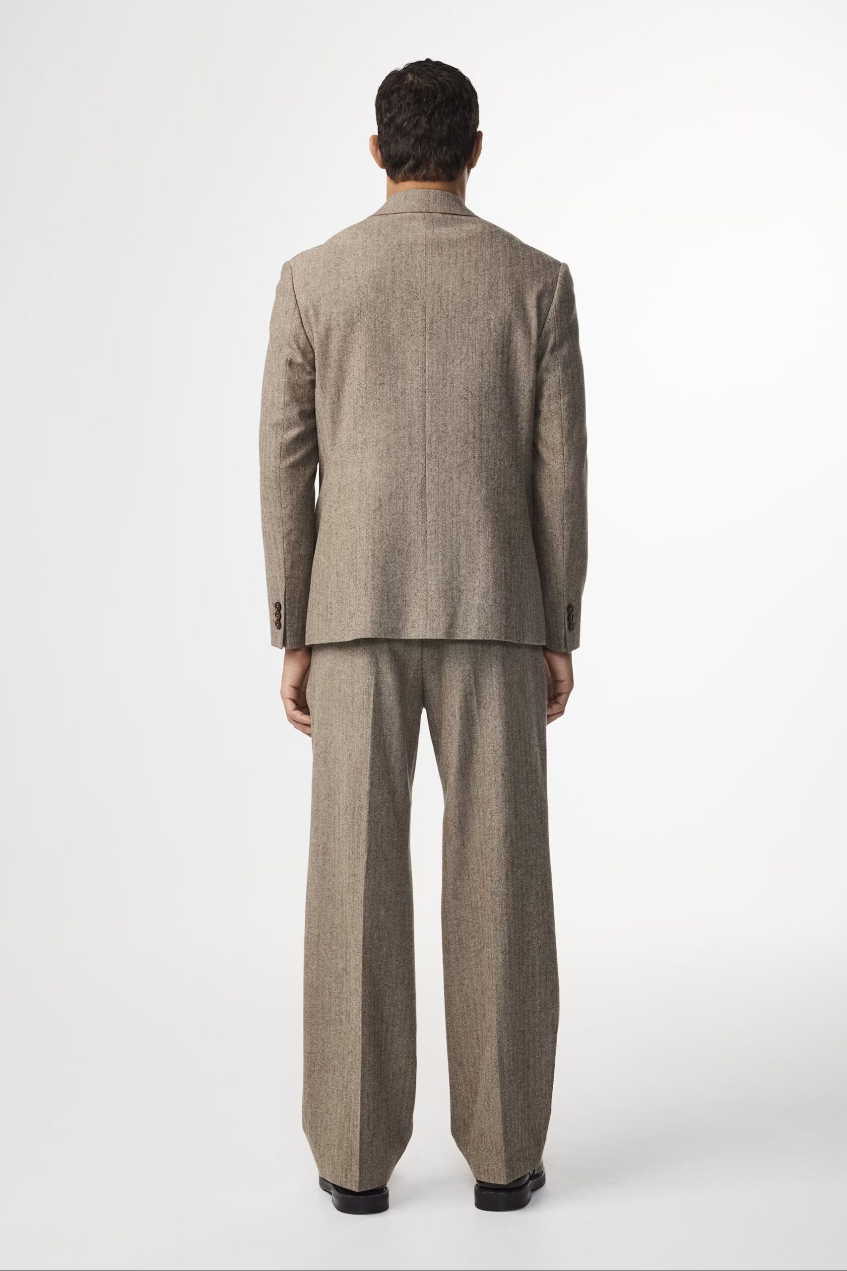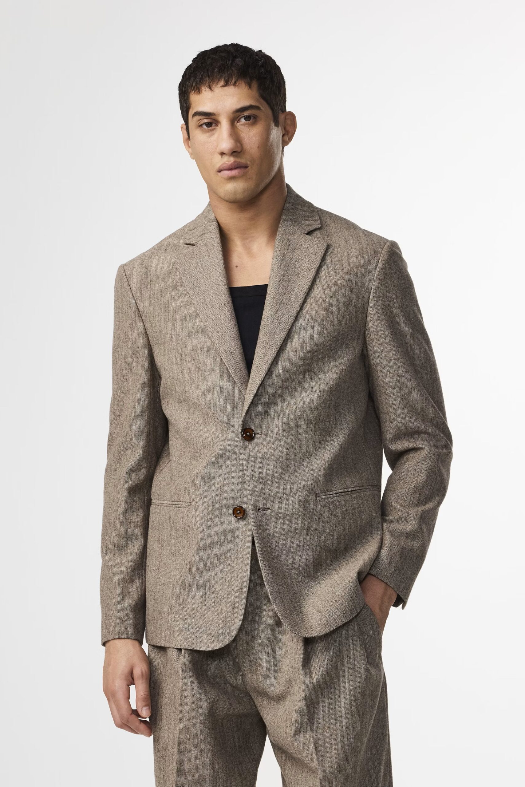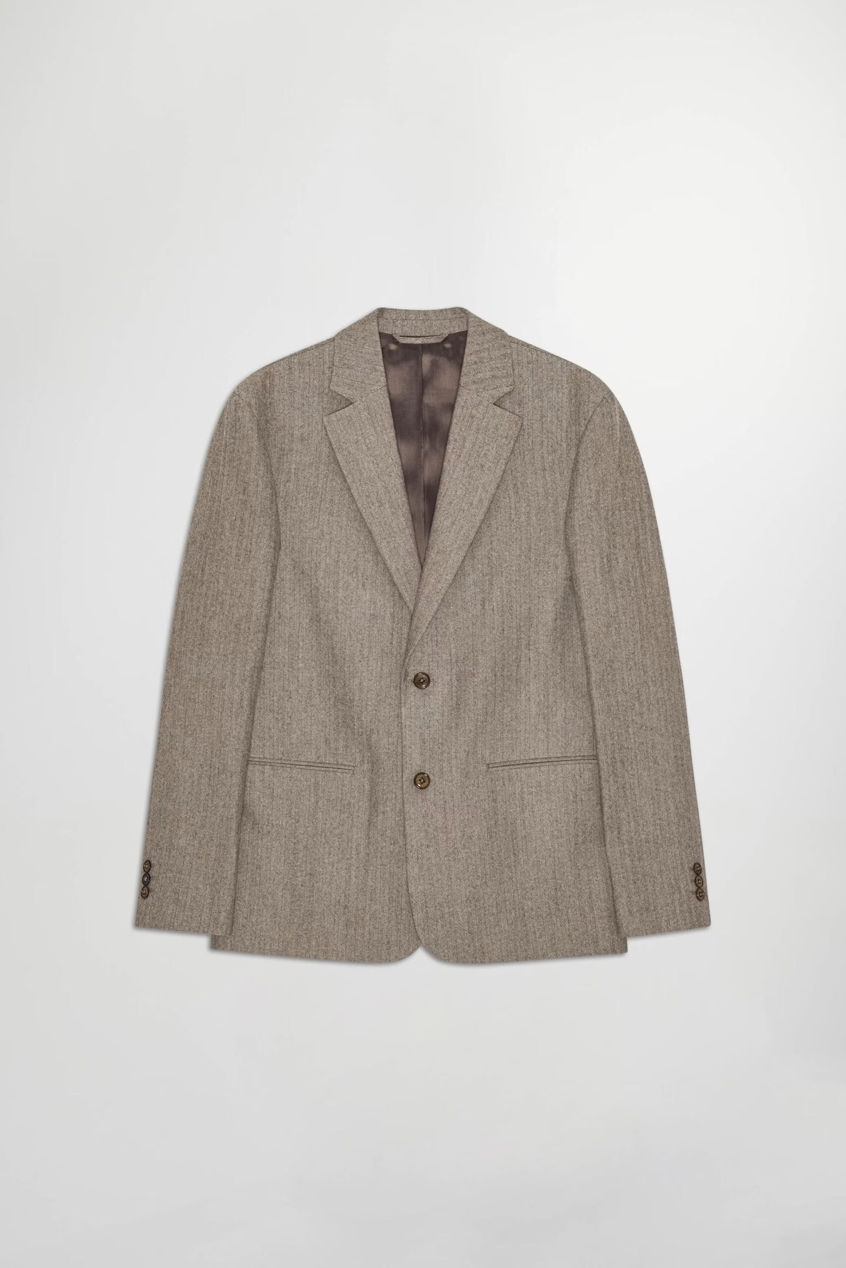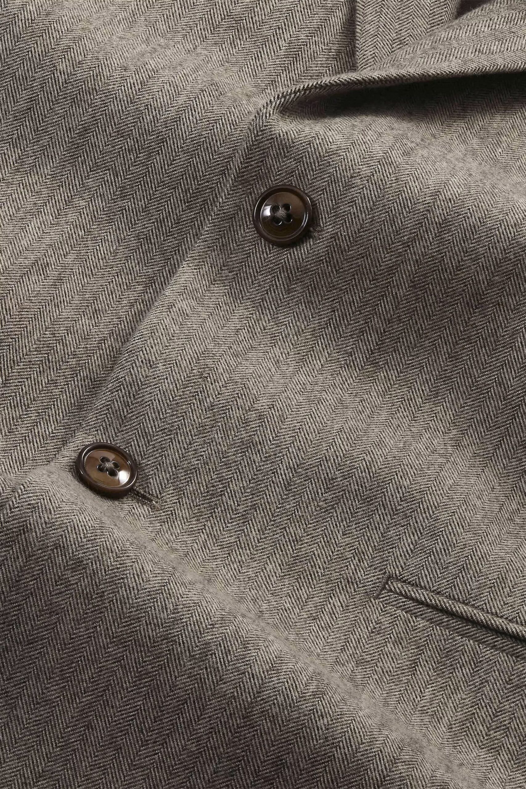 Blazer sophistiqué confectionnée dans un luxueux mélange de laine certifiée à chevrons, avec une finition brossée et une touche de stretch. Coupe décontractée avec poches et boutons en corozo naturel.